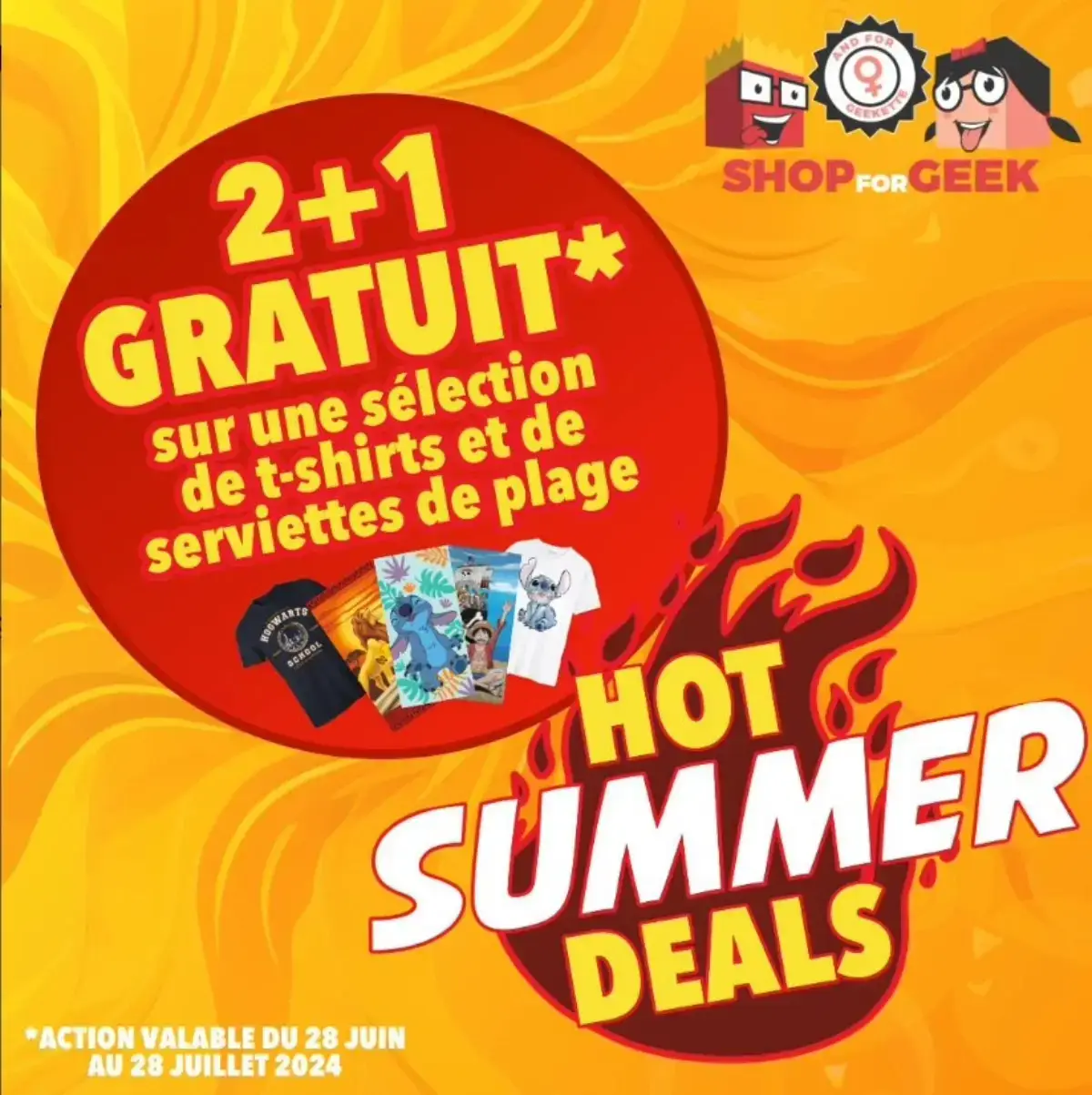 Du 28 juin au 28 juillet 2024*, profitez de notre promotion 2+1 gratuit sur une sélection de t-shirts et de serviettes de plage pop culture ☀️
